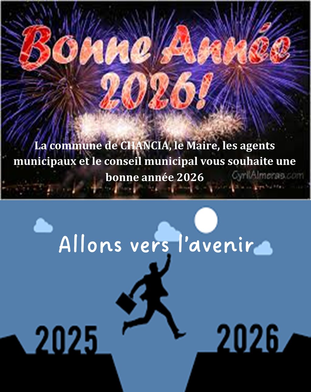 La commune de CHANCIA, le Maire, les agents municipaux et le conseil municipal vous souhaite une bonne année 2026.